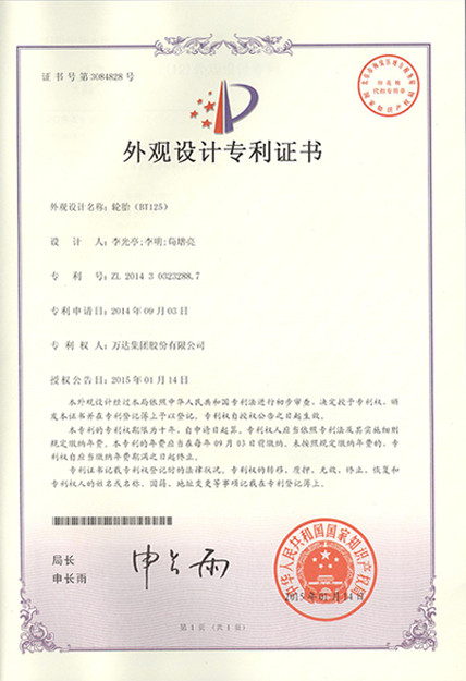 山东万达宝通轮胎有限公司注重产品研发和技术保护,积极开展专利申请工作,现有各类有效专利证书83件。