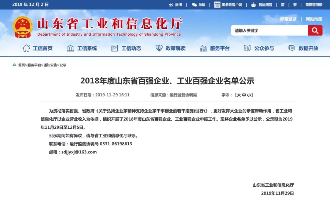 据悉,本次名单是贯彻落实省委、省政府《关于弘扬企业家精神支持企业家干事创业的若干措施(试行)》,更好发挥大企业的示范带动作用,省工业和信息化厅以企业营业收入为依据,组织开展了2018年度山东省百强企业、工业百强企业申报工作。