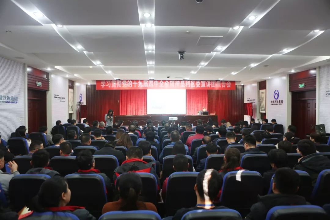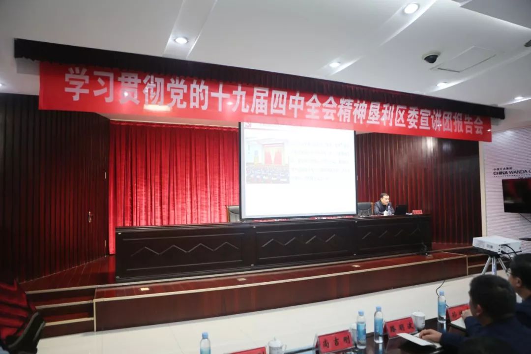 12月3日下午,垦利区委组织部副部长、区人社局党组书记、局长曹景华走进万达集团,在万达大厦12楼会议室举行“学习贯彻党的十九届四中全会精神宣讲报告会”,为广大党员详细解读和传达党的十九届四中全会精神。万达集团党委副书记、董事局董事、轮值执行总裁巴树山出席并主持报告会。