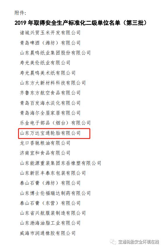 近日,山东省应急管理厅发布鲁应急告字〔2019〕25号公告,核准山东万达宝通轮胎有限公司为安全生产标准化二级企业,这是继2019年8月份公司获得全市安全生产月先进单位及通过省应急管理厅双重预防体系异地检查验收后,安全生产工作取得的又一荣誉。