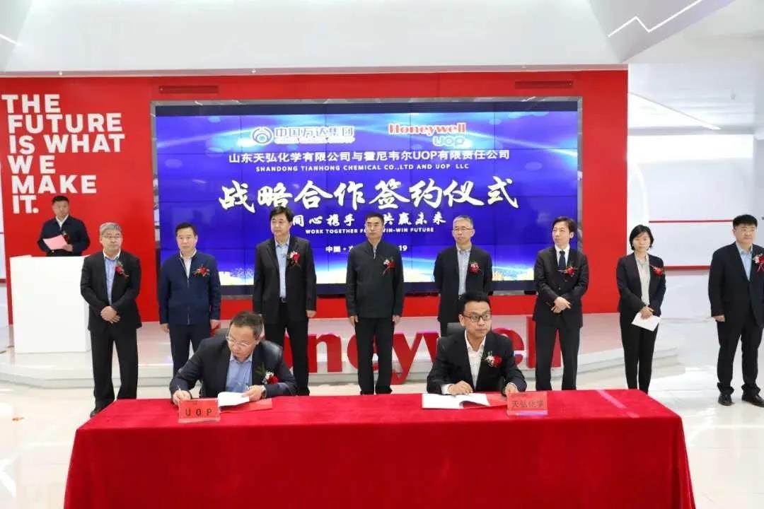 在山东省高端化工产业技术研究院三楼,中国万达集团天弘化学公司与霍尼韦尔UOP公司签订战略合作协议。随后,来宾人员实地参观了万达石化研究院和万达集团临港石化产业园。
