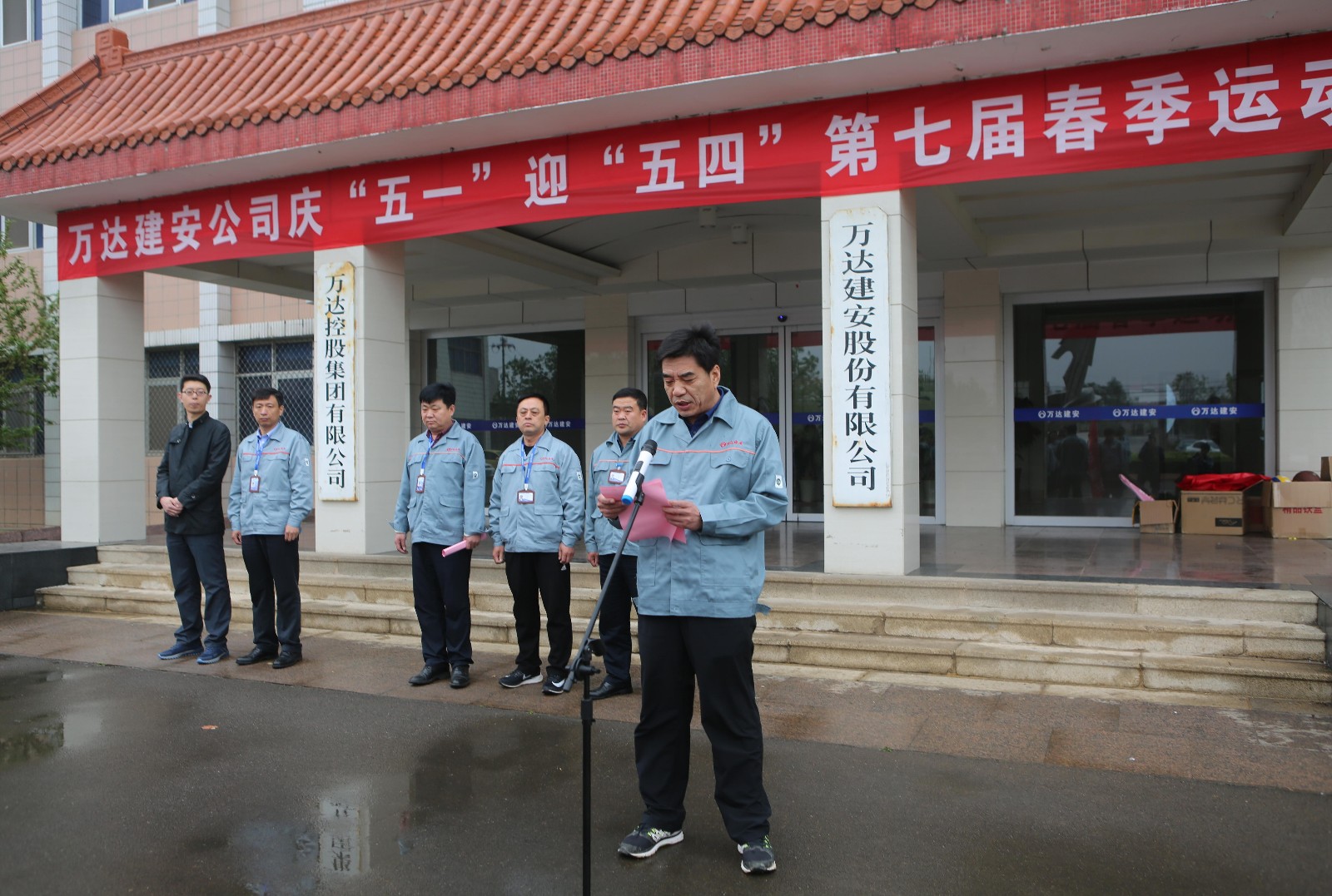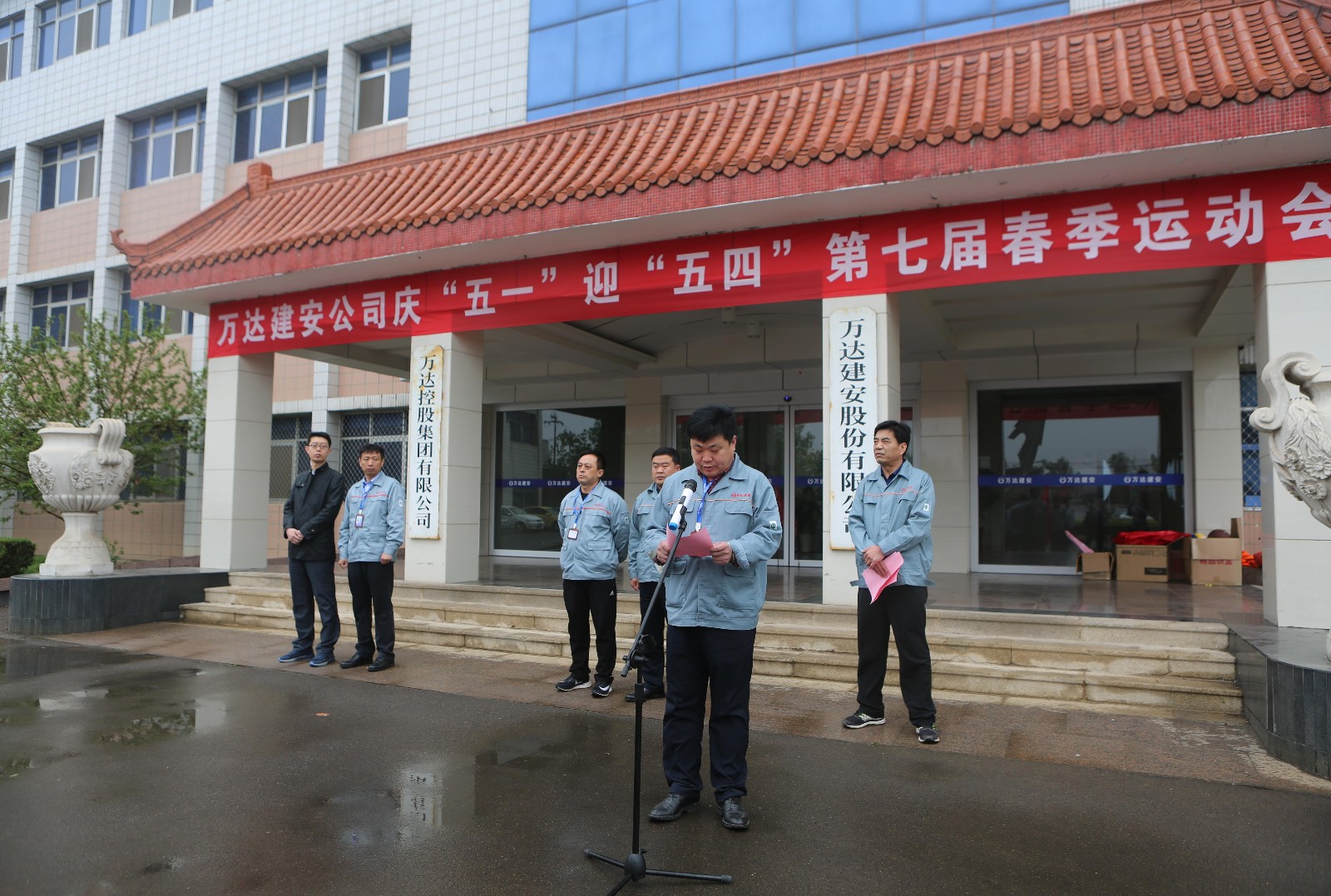 开幕式上午8点半准时开始,运动会开幕式由万达集团总裁助理、万达建安执行总裁巴恩杰主持,万达集团副总裁、万达建安董事长尚吉刚在开幕式上发表了热情洋溢的讲话,并预祝本次运动会取得圆满成功,集团公司办公室赵新路主任参加了开幕式。由建筑公司、装饰公司、市政公司、安装公司和后勤部室组成的5个方阵在红色队旗的引导下,接受领导和全体干部员工的检阅。充分展现了建设集团的精神风貌。