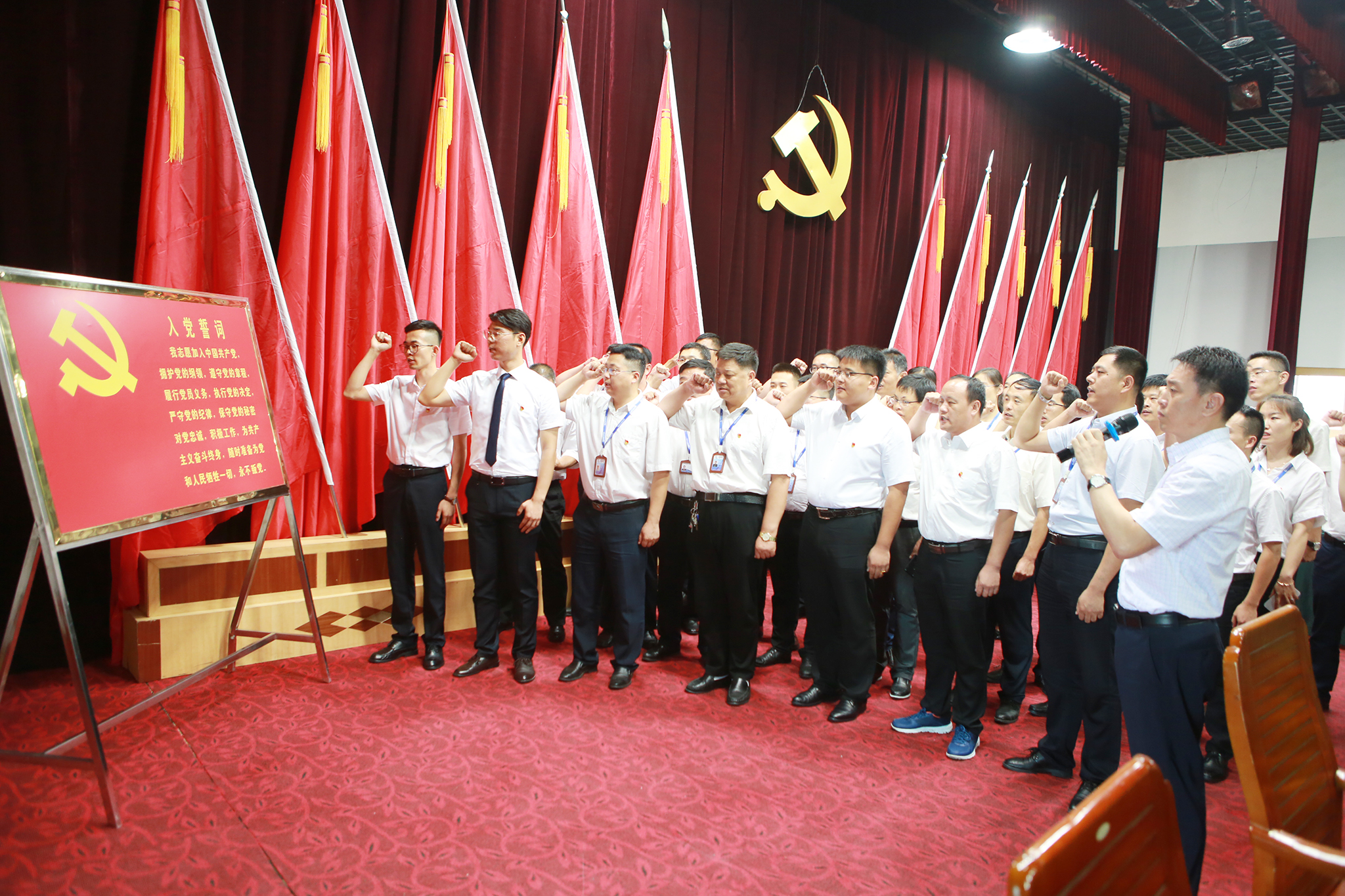 万达集团董事局董事、轮值执行总裁巴洪社带领公司转正党员、优秀党员一同进行了入党宣誓和重温入党誓词仪式。