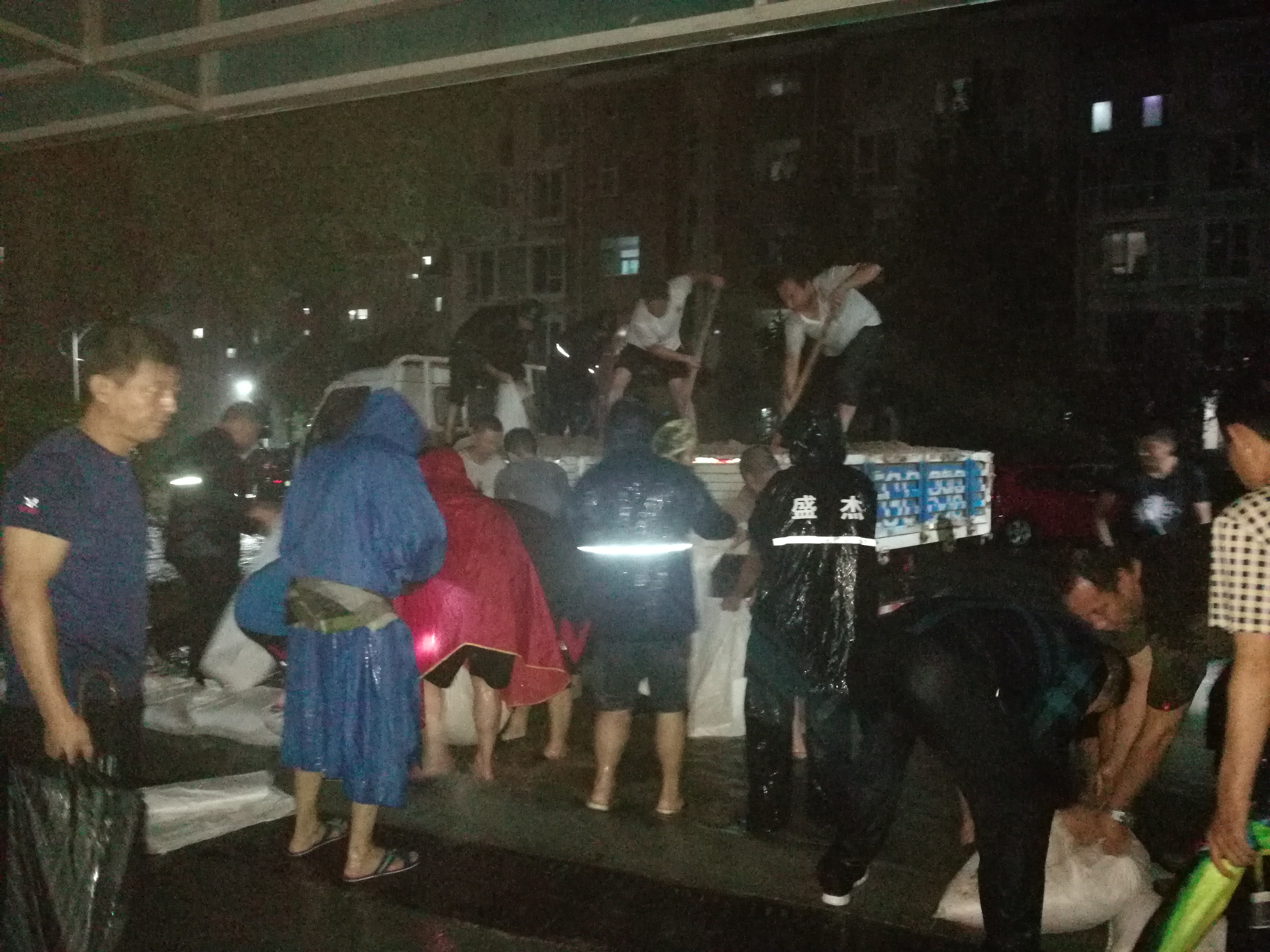 晚8时许,当排查到万达高尔夫花园小区地下停车库时,发现现场大量雨水倒灌险情。随即启动地产集团暴雨漏水应急预案,第一时间组织人员疏散地下车库车辆,启动地下车库8部强排,调度沙袋等抢险物资,并组织人员30余人进行坡道口封堵。地产集团董事长高兴军、执行总裁路明波、常务副总巴希敏等领导第一时间到现场,靠在现场,亲临指挥,地产集团就近居住职工陆续自发驱车前往应援。