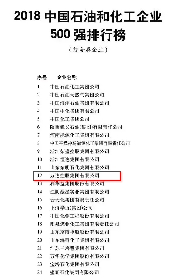 8月22日,“2018中国石油和化工企业500强发布会暨创新与引领——中国石油和化工大企业高峰论坛”在上海隆重召开。会上,揭晓了2017年度中国石油和化工企业500强榜单。其中,万达集团荣列综合类企业榜单第12位。
