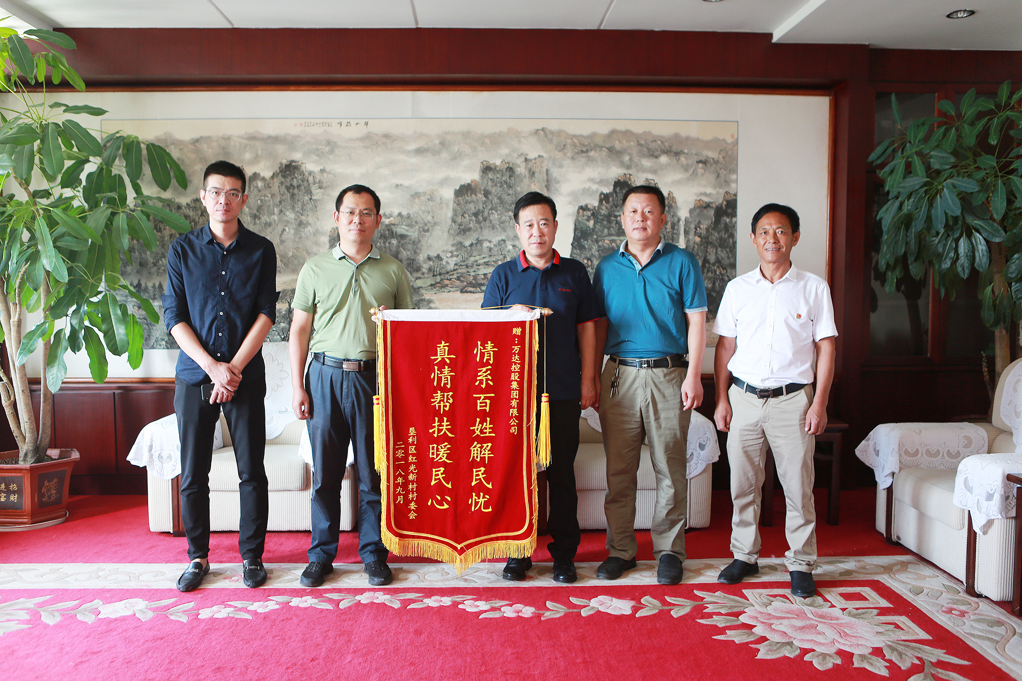 9月7日,垦利区永安镇红光新村村支部书记董在昌来到万达集团,将一面“情系百姓解民忧 真情帮扶暖民心”的锦旗送到万达集团董事局董事、副总裁巴树山手中,以此表达对驻村扶贫工作队的肯定和万达集团的感谢。东营市现代渔业示范区刘增波副书记,市经信委段作杰科长等陪同来访。