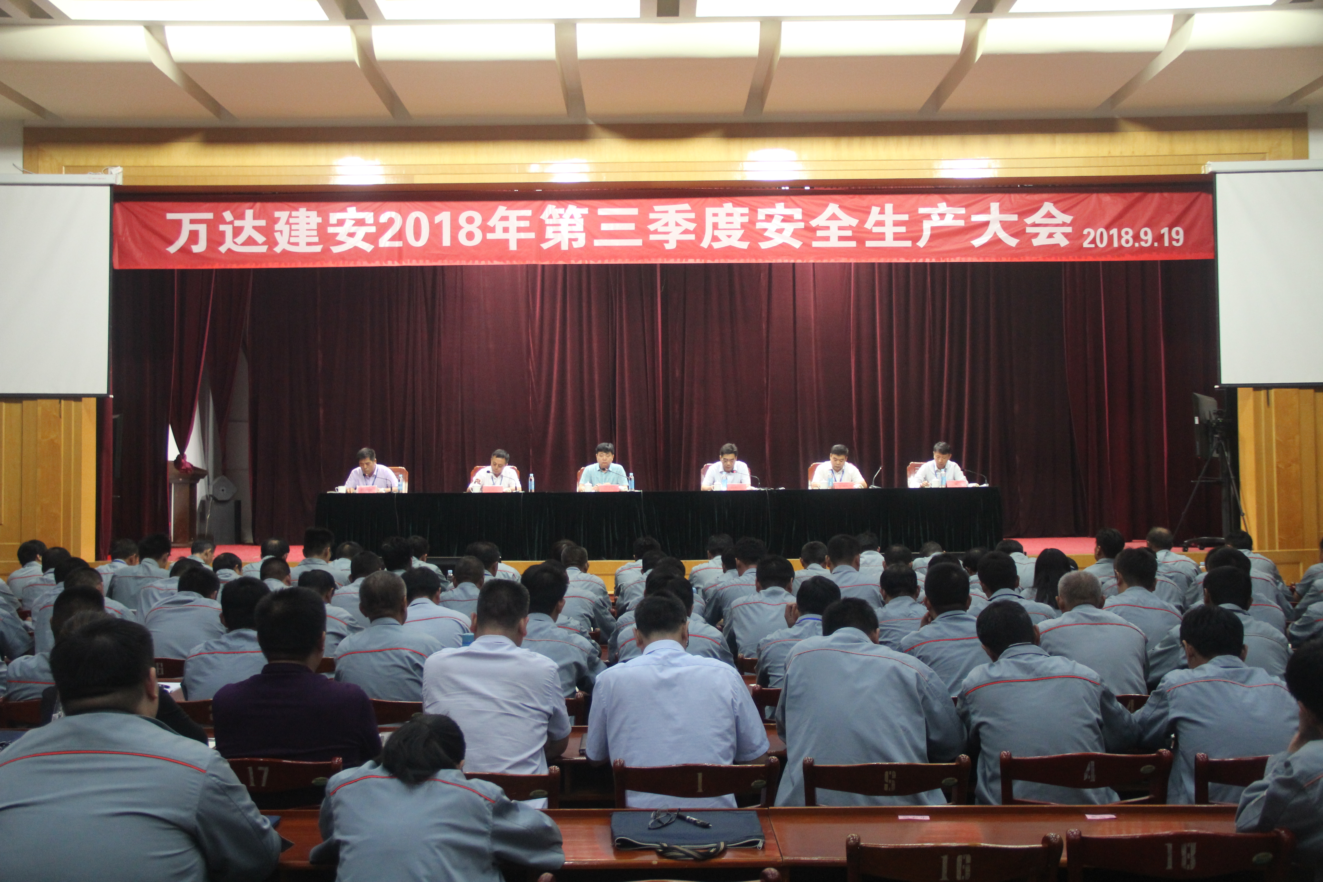 9月19日上午,建安公司在生活服务公司二楼会议室召开了2018年第三季度安全生产大会,本次会议由初级专员及以上人员;职能部室全体人员;各分公司项目经理、项目负责人、预算员、施工员、技术员、安全员等与工程管理相关的200余人参加。技术质量安全环保部经理张志国做《万达建安2018年第四季度安全工作汇报》和传达学习市住建局下发两个文件,万达集团副总裁、建设集团董事长尚吉刚,万达集团总裁助理,建设集团执行总裁巴恩杰出席会议并作重要讲话。