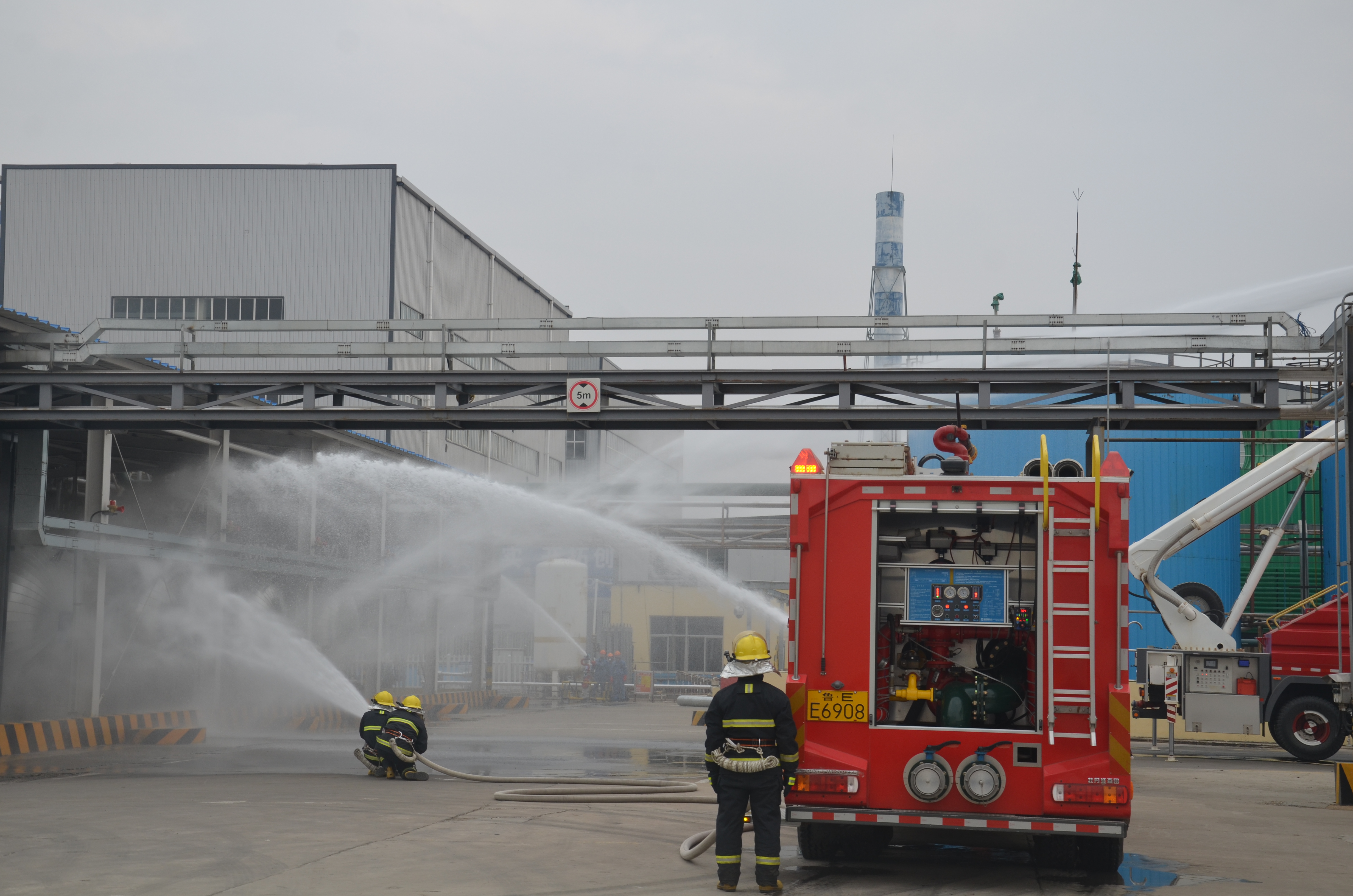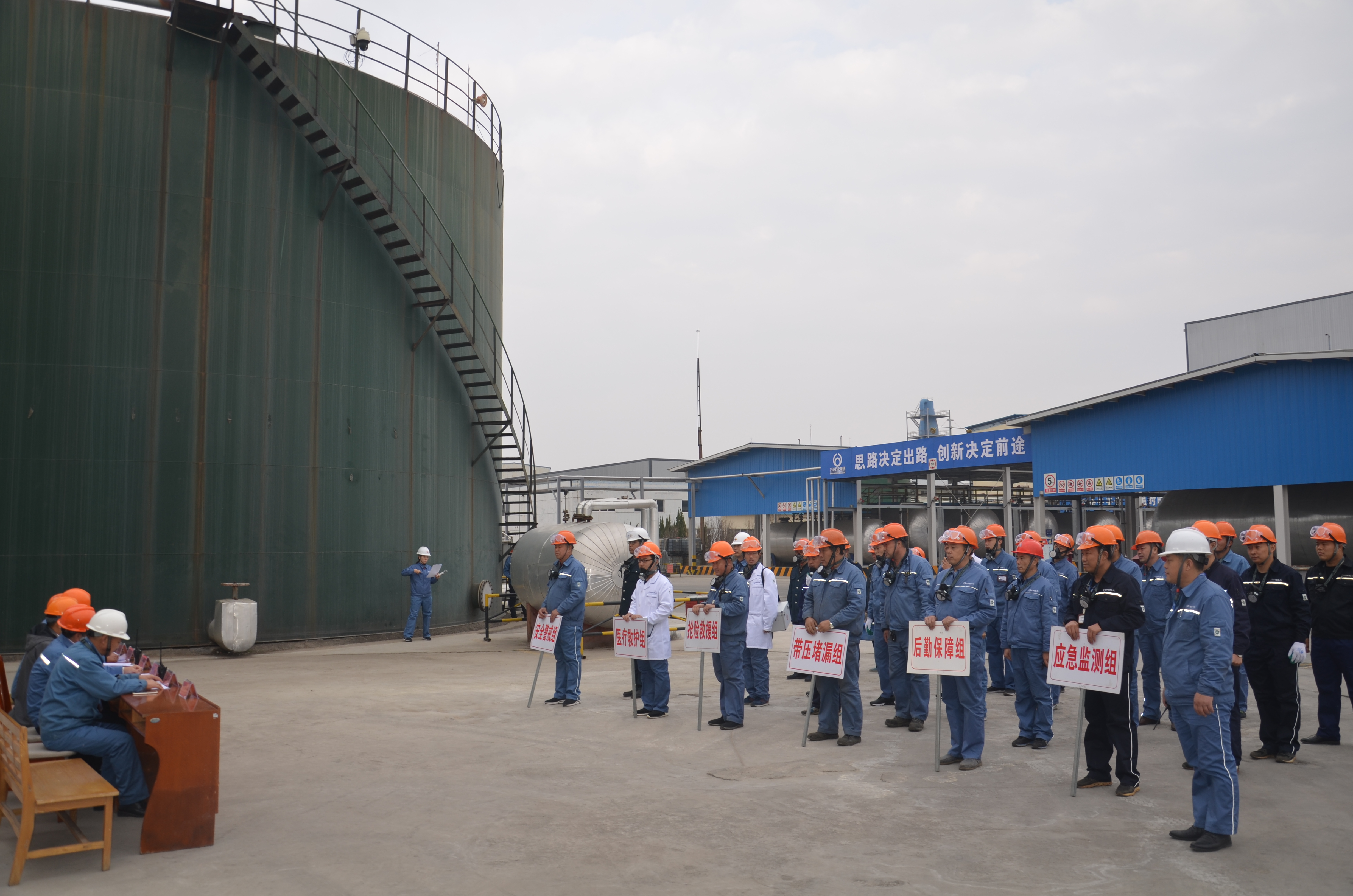 11月23日下午,化工公司为了进一步强化员工消防安全意识,提高抗击突发事件的应变能力,能够迅速有组织的安全疏散,掌握正确应急处理措施以及逃生的方法,化工公司协同垦利区消防大队、威特化工消防队,在公司罐区组织进行丁二烯泄露事故应急预案演练。集团公司战略与科技管理部副主任燕增峰、化工公司董事长胡国强、安全副总巴欣民、生产副总周光和、技术总工谢丰鸣等领导莅临现场观摩。