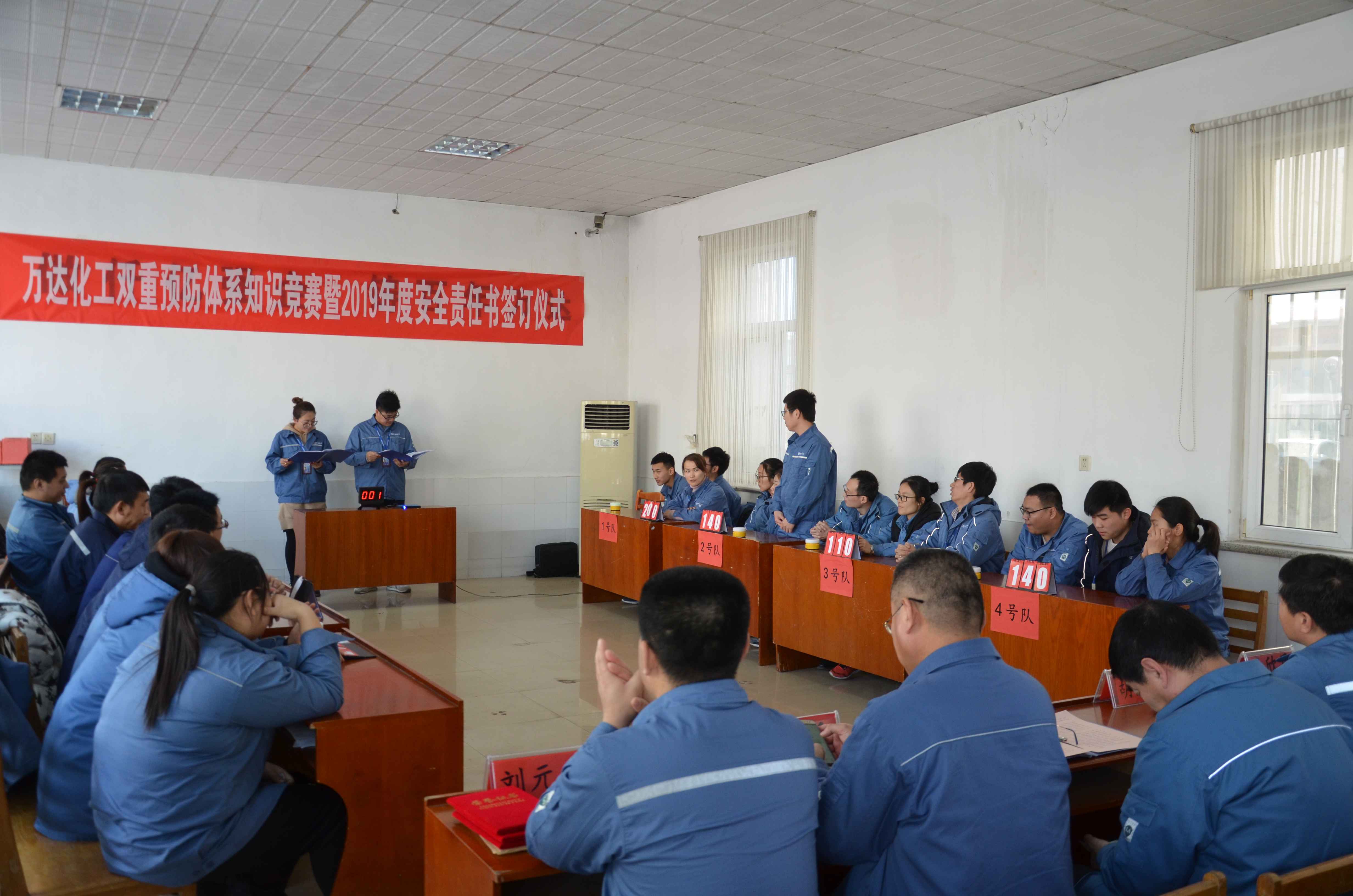 为了进一步巩固双重预防体系建设成果,全面落实安全生产主体责任。以丰富职工安全文化生活,确保全年零事故为目的,充分调动广大员工参与双重预防体系建设的积极性、主动性和创造性。化工公司于2019年1月23日下午举行“双重预防体系”安全知识竞赛。化工公司董事长胡国强、总经理王洪举、安全副总巴欣民、生产副总周光和、总工程师谢丰鸣及各部门、车间负责人、员工代表参加了此次活动。