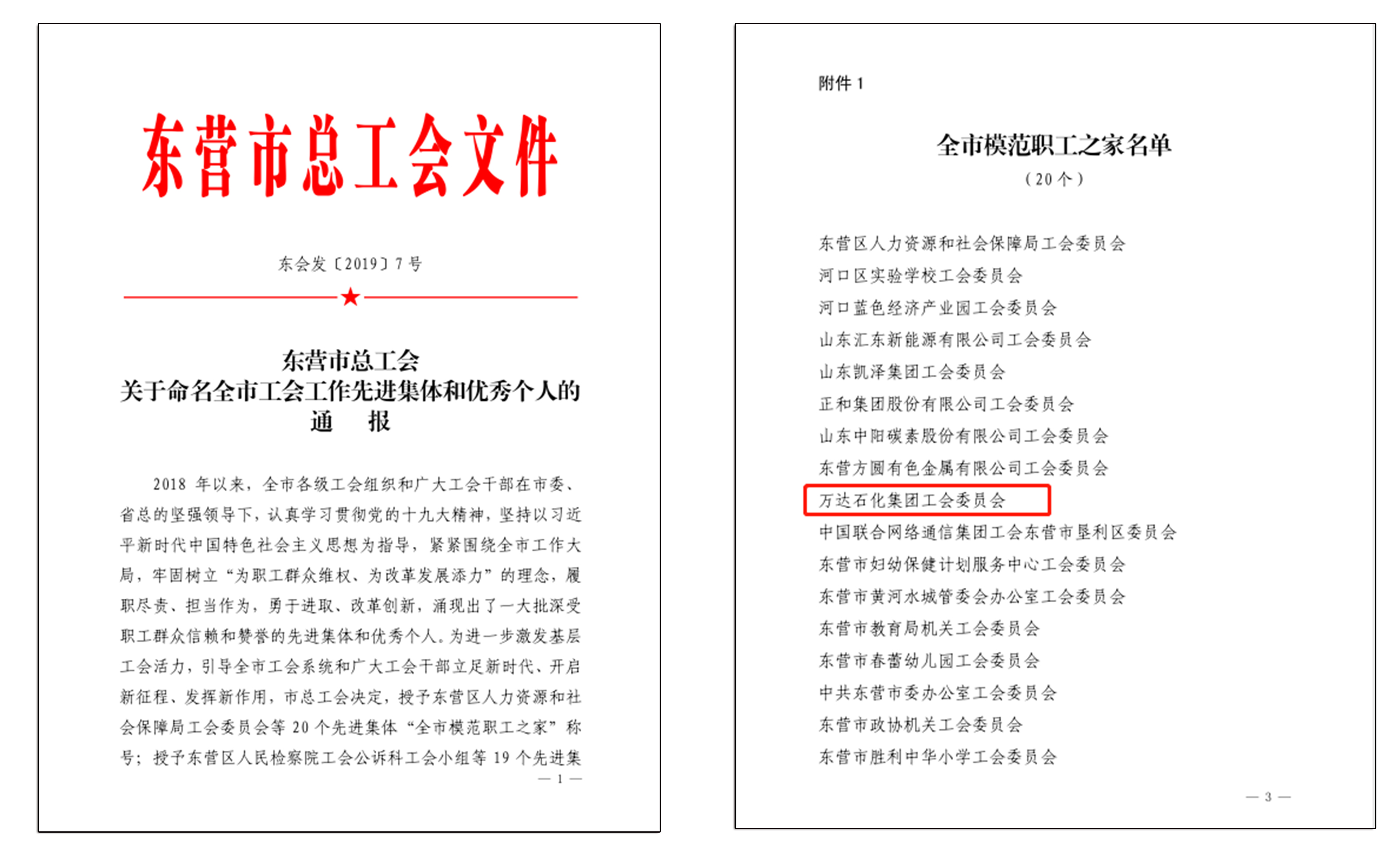 近日,东营市总工会下发《关于命名全市工会工作先进集体和优秀个人的通报》,表彰了一批深受职工群众信赖和赞誉的先进集体和优秀个人。其中,万达石化集团工会从众多参选单位中脱颖而出,荣膺“全市模范职工之家”称号,彰显了万达石化集团以人为本、关爱员工的大企业形象。
