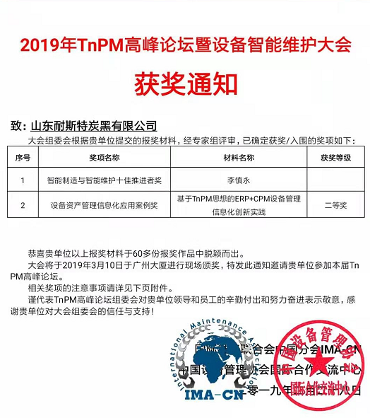 日前,中国设备管理协会国际合作中心和国际维修联合会中国分会公布了2019年TnPM高峰论坛暨设备智能维护大会获奖名单,集团公司及炭黑公司榜上有名。